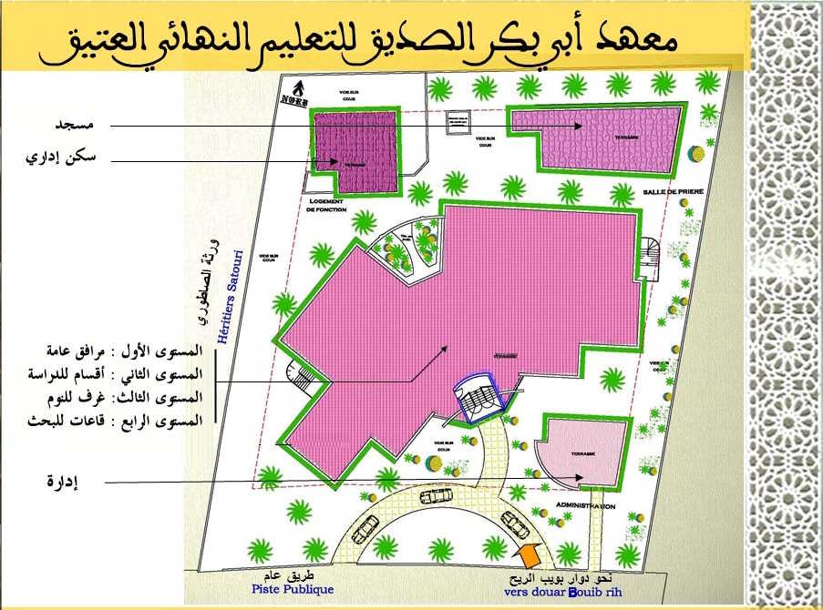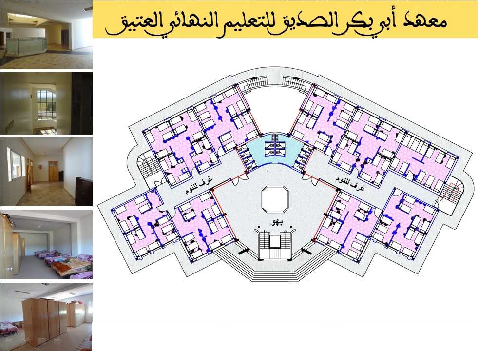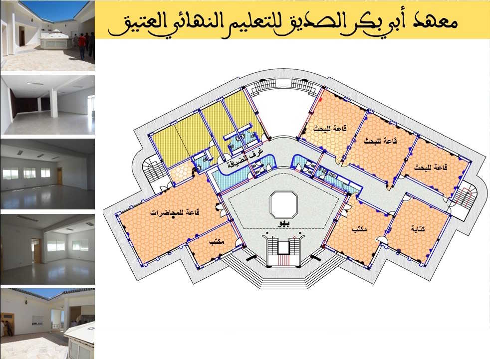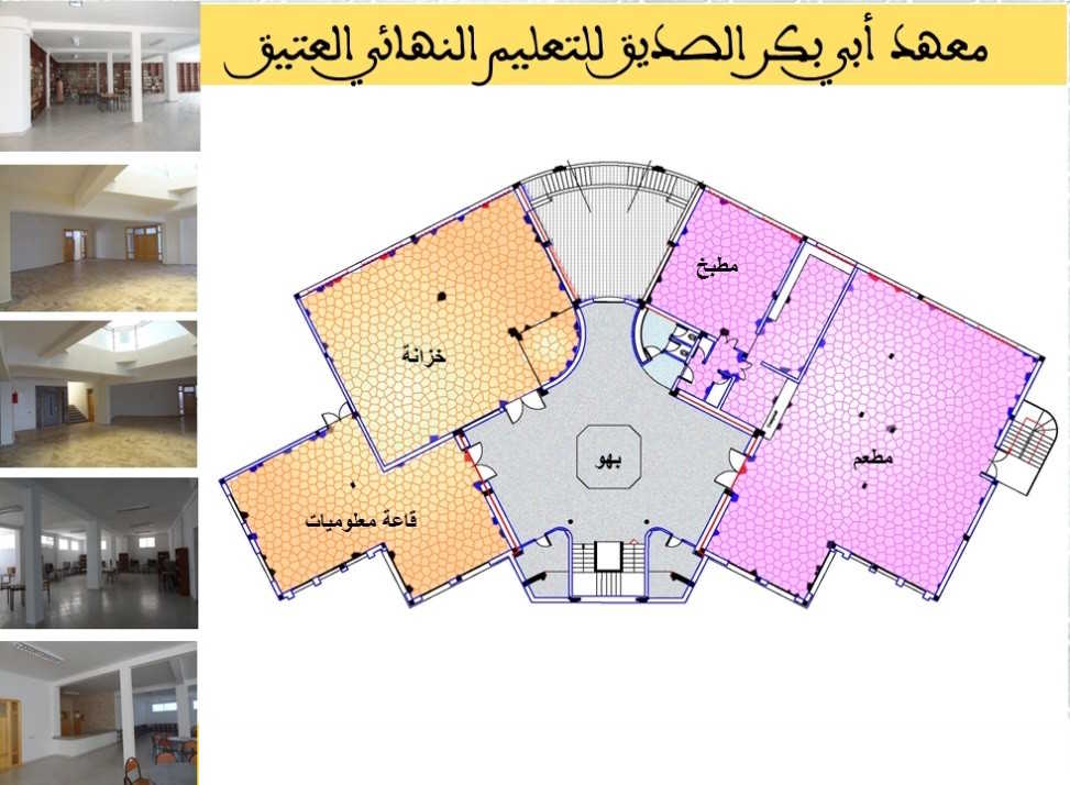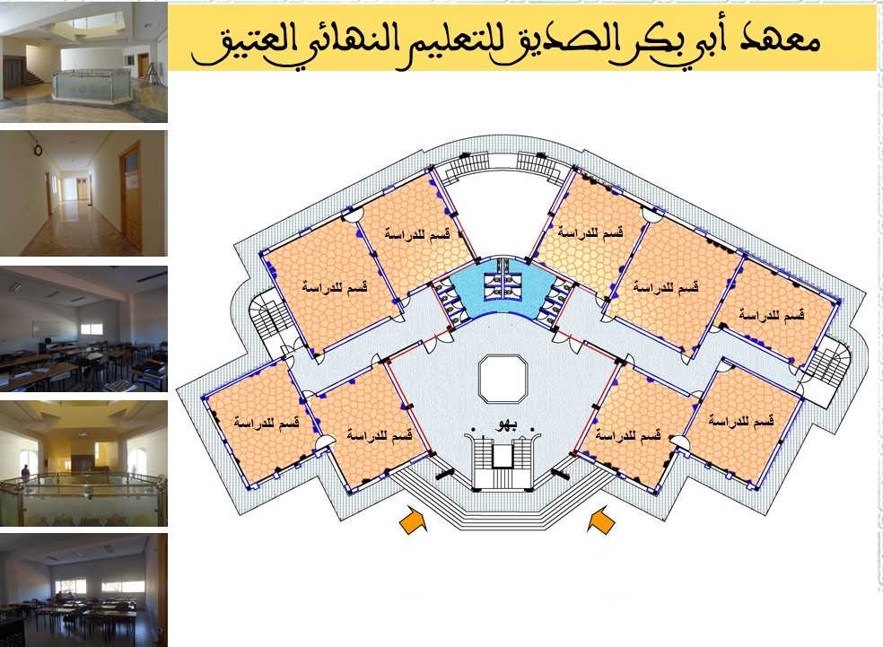 تعريف عام بالمعهد هو مؤسسة خاصة للتعليم النهائي العتيق الذي تشرف عليه وزارة الأوقاف و الشؤون الإسلامية.أسسته جمعية أبي بكر الصديق للتربية والرعاية الاجتماعية، التي يرأسها الأستاذ الدكتور الشاهد البوشيخي،بتاريخ: 24 ذي القعدة 1434 الموافق 01 أكتوبر 2013.مخصص لطور التعليم النهائي العتيق، وما يرجى أن يتلوه.جُلّ أطره التربوية والإدارية يحمل شهادة الدكتوراه.تكويناته متعددة: أساسية، وإضافية ، وموازية .نظام الدراسة به داخلي، وخارجي ، وبالمجان.روافده: ثانويات التعليم العتيق أساسا.يستقبل الطلبة من داخل الوطن وخارجه.عدد الحاصلين على العالمية من المعهد الى حدود السنة الدراسية 2023-2024: 190 عالما مكونات المعهد التصميم العاميظهر موقع المعهد المستوى الأول من المبنى الرئيسيخصص للمرافق العامة : المطبخ ،المطعم، المكتبة، قاعة المعلوميات. المستوى الثاني من المبنى الرئيسيخصص للدراسة. وبه تسعة أقسام. المستوى الثالث من المبنى الرئيسيخصص لسكنى الطلبة. وسعته نحو 240 سرير. المستوى الرابع من المبنى الرئيسيخصص للبحث العلمي؛ به ثلاث قاعات للبحث وقاعة للمحاضرات، وغرف لإقامة الضيوف.